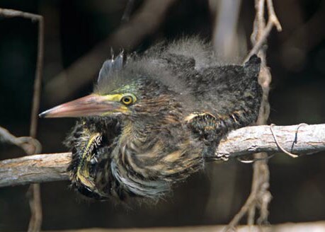 An immature green heron resting on a branch. This little guy was clowning for the camera. Great photo for a child's room.