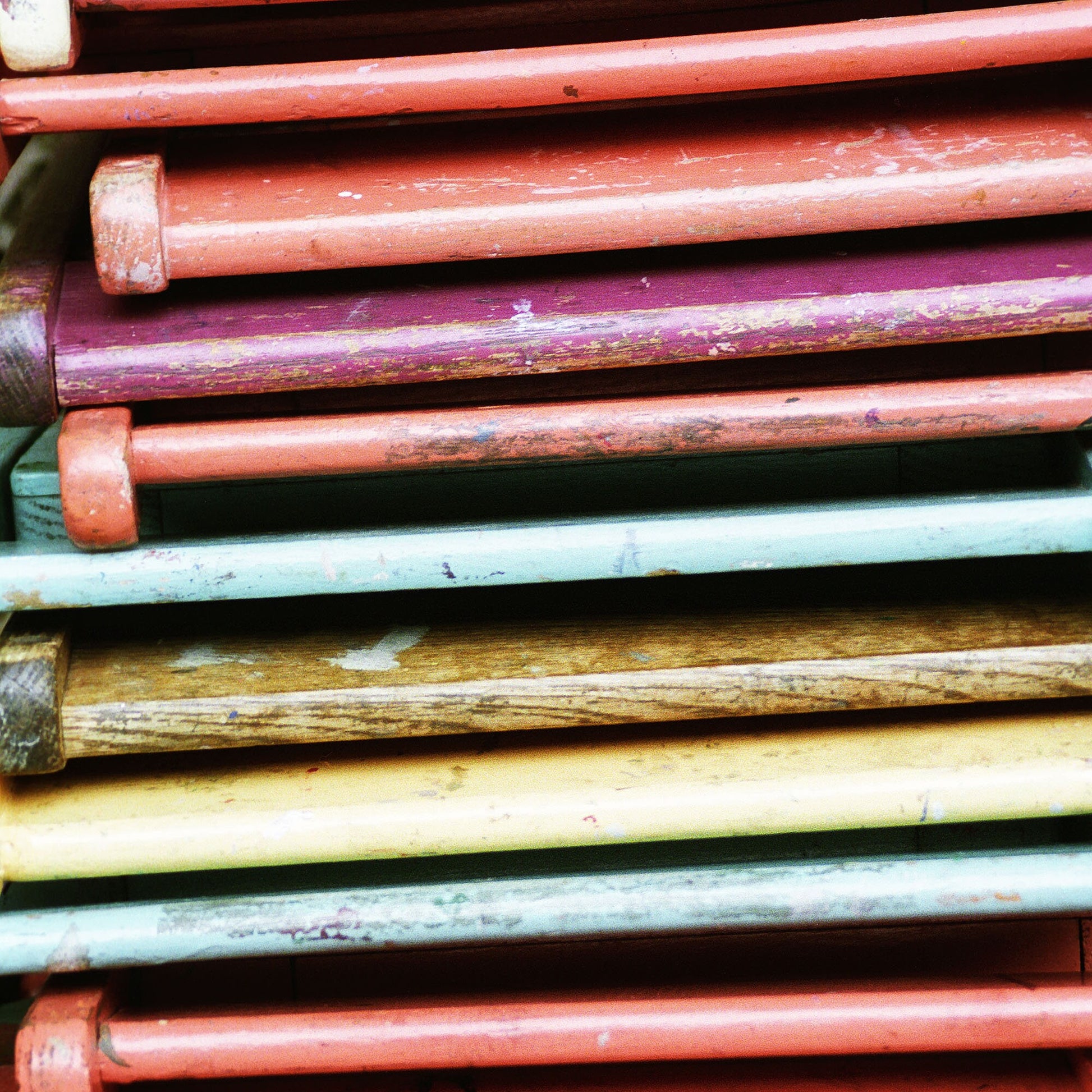 A stack of whimsical wooden folding chairs that have been painted in bright colors.