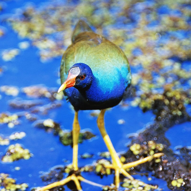 A purple galinule that blends with its background. It is amazing how that its vibrant colors work so well. What is interesting is the way the tail blends with the background. This was taken in southern Florida.
