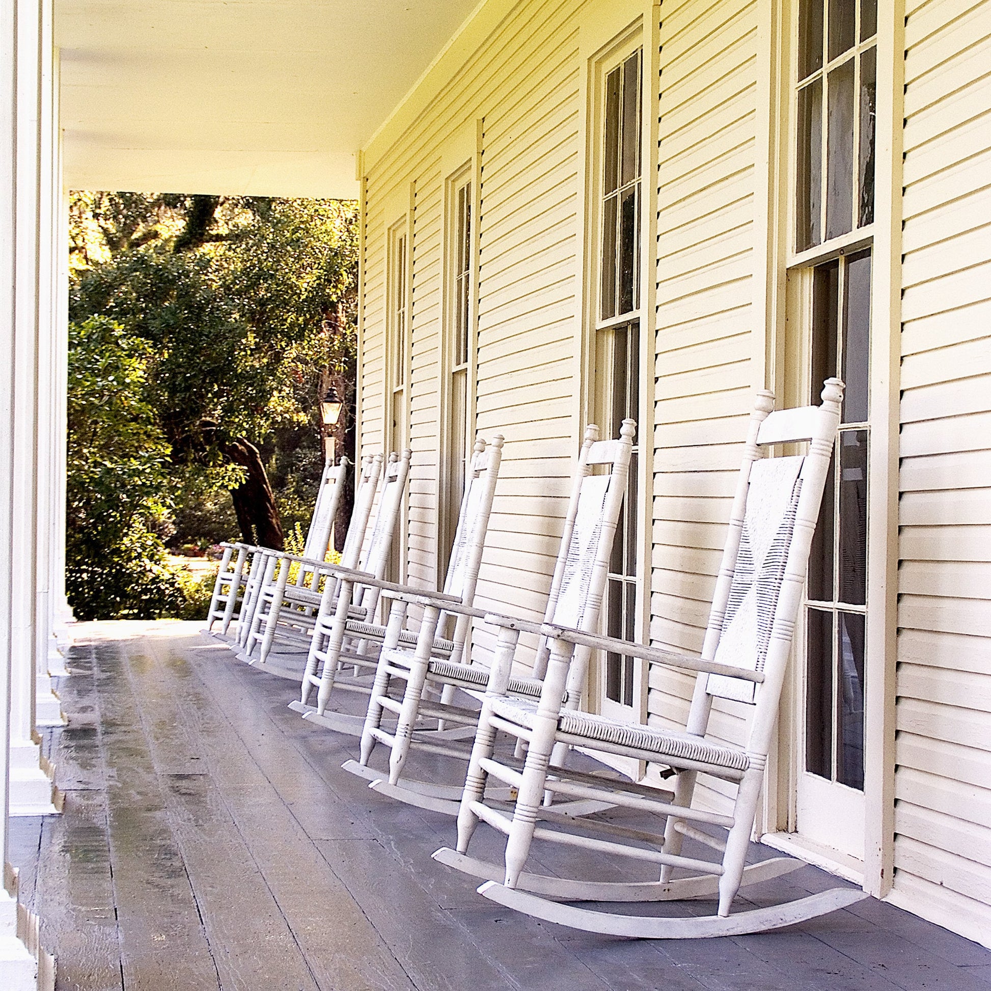 Six white rocking chairs on a porch at Eden State Park near Panama City Florida.