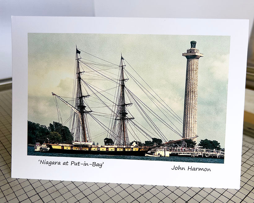 A fine art print of the restored tall ship Niagara docked in front of Perry's Monument at Put in Bay Ohio. The Niagara was Perry's flagship during the war of 1812. A major sea battle was fought within a mile of the monument.