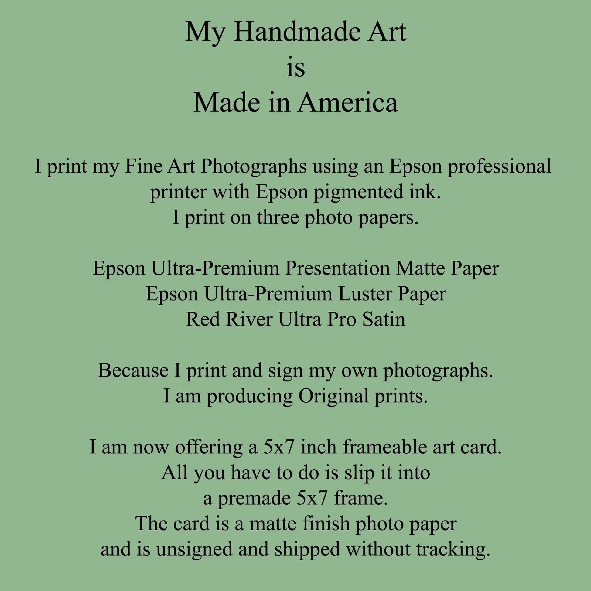 An Epson professional printer is used on with Epson pigmented inks. Using Epson products this ensures archival-quality prints. All prints are signed on the white border
